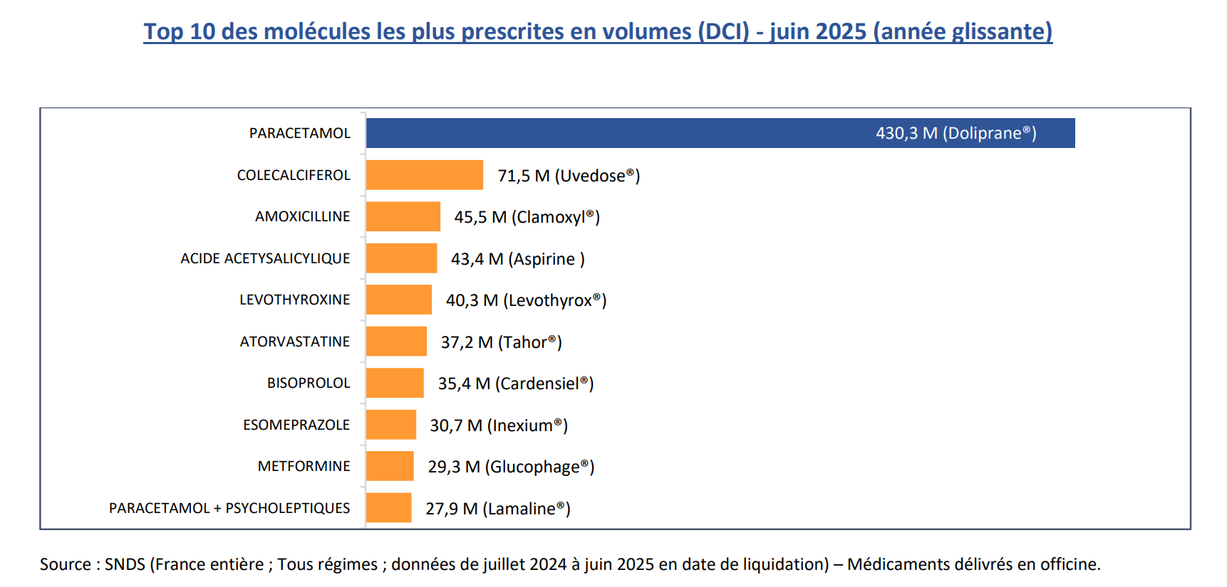 Top 10 des molécules les plus prescrites en volume (DCI)
