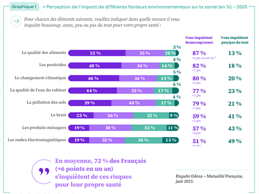 Ce chiffre en hausse de 6 points en un an, issu du Baromètre santé-social 2025 de la Mutualité Française et de l’Association des maires de France et des présidents d’intercommunalité, traduit une préoccupation croissante de la population. L’inquiétude est particulièrement marquée concernant la qualité de notre alimentation (87%) et l’usage des pesticides (82 %).