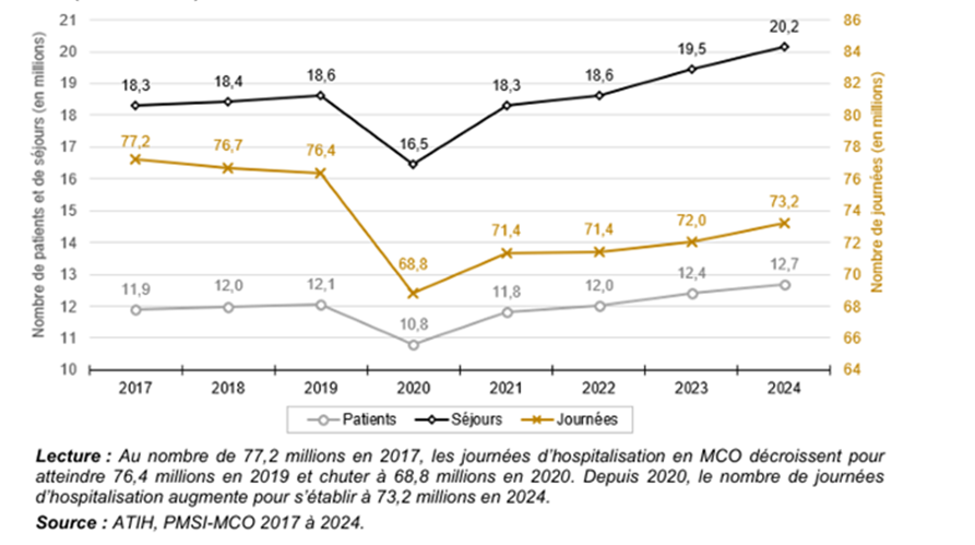 Cette hausse s’explique en grande partie par le rebond post-Covid : durant la crise sanitaire, l’activité des MCO avait chuté de 11,8 %, principalement en raison de la déprogrammation des soins non urgents. Entre 2023 et 2024, 707 000 hospitalisations supplémentaires ont été enregistrées en un an, portées notamment par une progression des séjours avec nuitées (+1,1 %), tandis que leur durée moyenne reste stable à 6,5 journées.